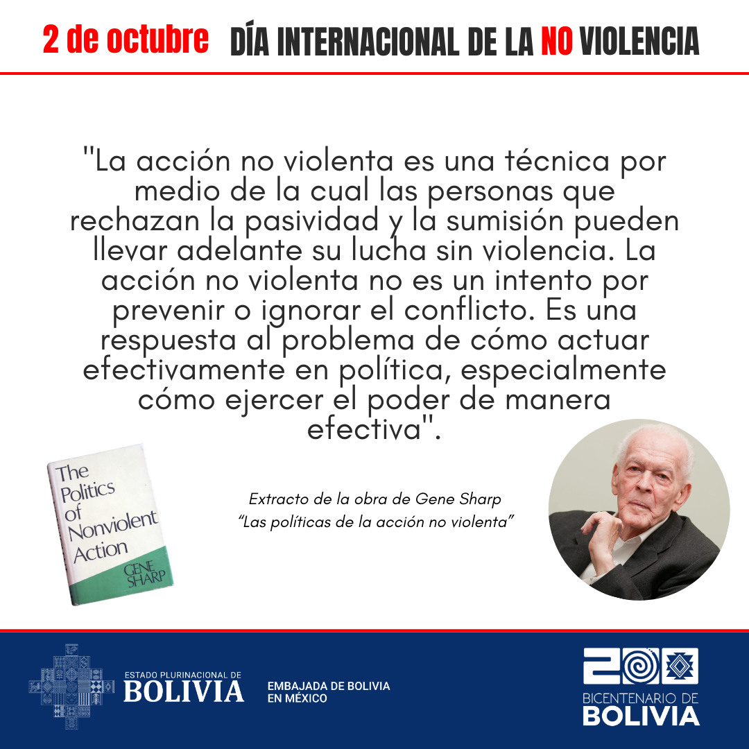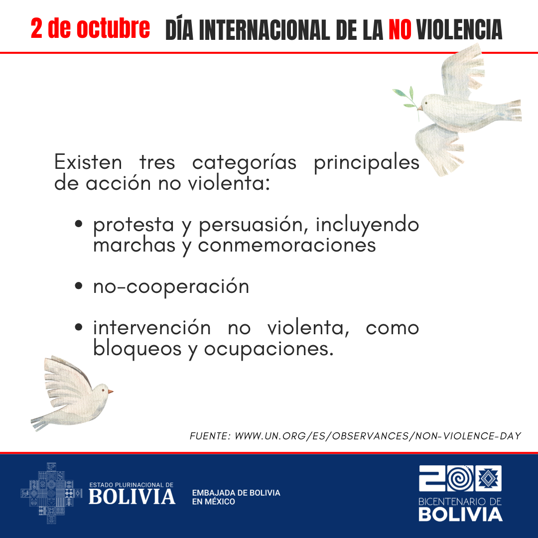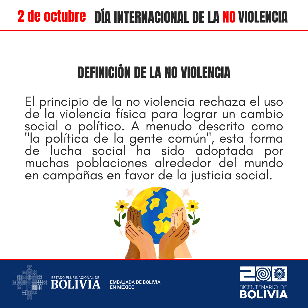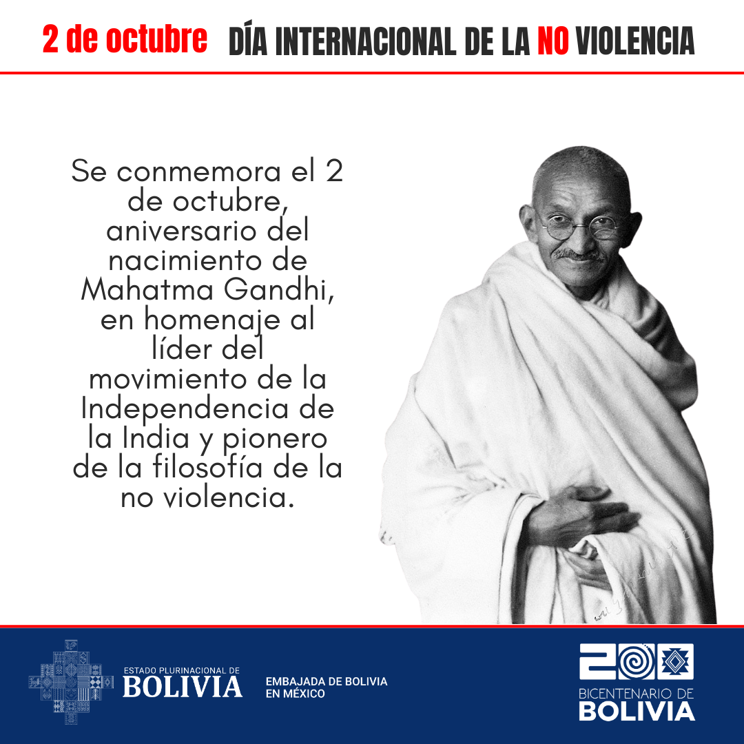 El día Internacional de la no violencia se celebra el 2 de octubre, día del aniversario del nacimiento Mahatma Gandhi, líder del movimiento de la Independencia de la India y pionero de la filosofía y la estrategia de la no violencia.