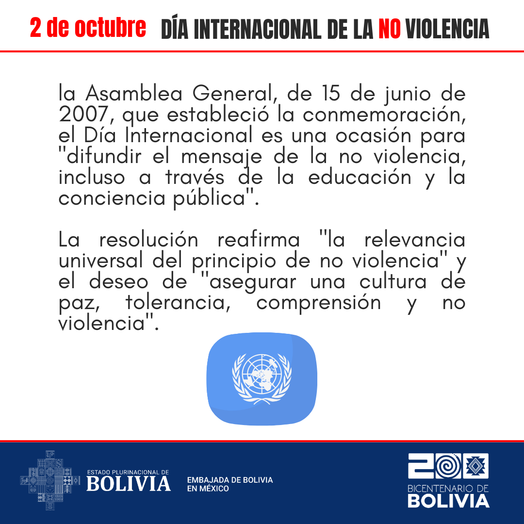 El Día Internacional es una ocasión para «diseminar el mensaje de la no violencia, incluso a través de la educación y la conciencia pública». La resolución de las Naciones Unidas que establece el día afirma que este día busca «la relevancia universal del principio de la no violencia» y el deseo de «conseguir una cultura de paz, tolerancia, comprensión y no violencia».